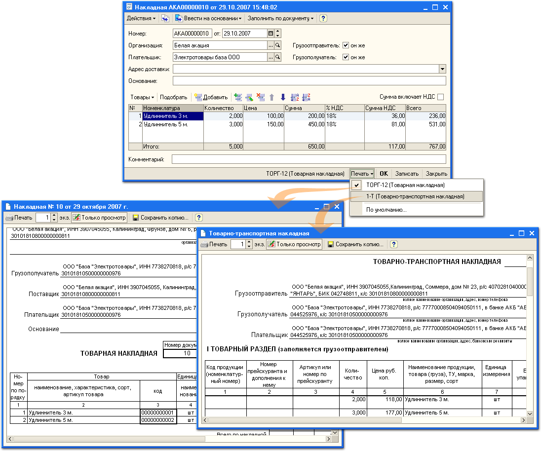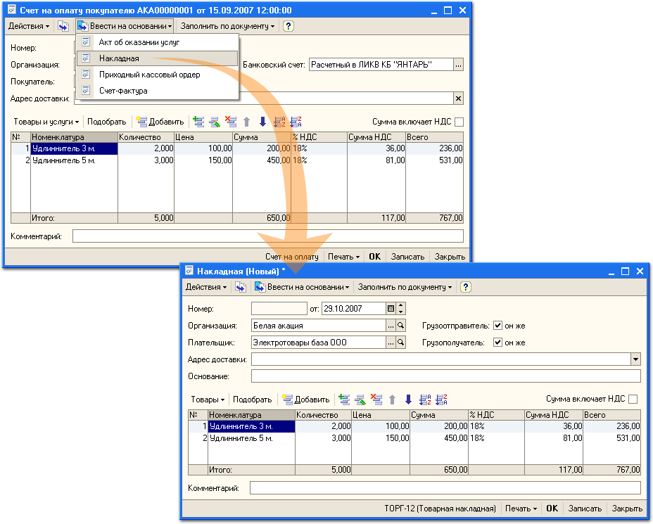 Ввод одних документов на основании других ускоряет оформление комплекта связанных документов (например: счет на оплату - накладная - счет-фактура).