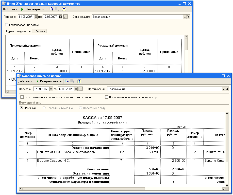 По введенным кассовым документам автоматически формируются кассовая книга и журнал регистрации кассовых ордеров.